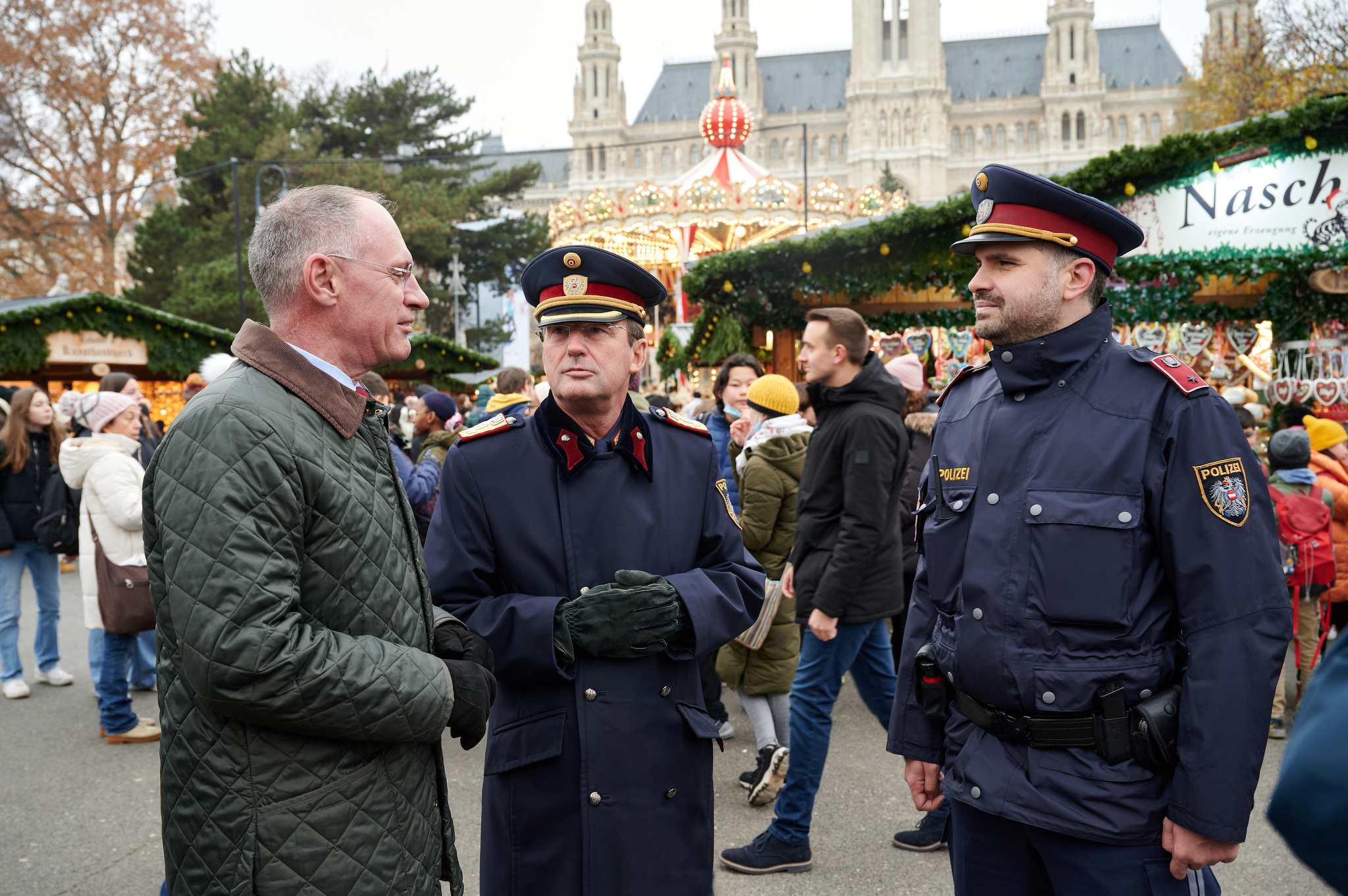"Die Christkindlmärkte sind so gut besucht wie schon lange nicht, auch viele Touristen besuchen unsere Märkte. Die Polizei ist in Zivilkleidung und in Uniform zur Sicherheit der Bevölkerung und gegen Diebstähle verstärkt im Einsatz", sagte Innenminister Gerhard Karner am 9. Dezember 2022 bei einer Visite des Einsatzes am Christkindlmarkt am Wiener Rathausplatz. Zahlreiche Polizistinnen und Polizisten werden auch dieses Jahr wieder auf den Wiener Christkindlmärkten eingesetzt.